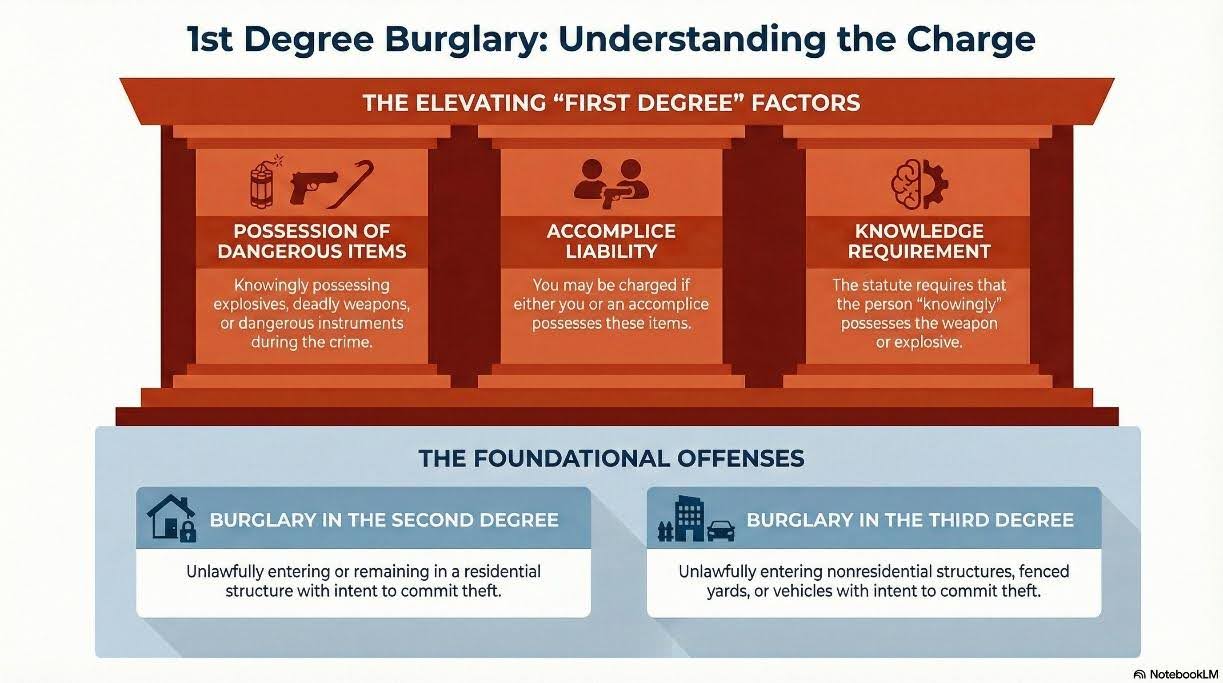 Firstdegree burglary is the most serious burglary charge you can face in Arizona because it involves added dangerous elements. You commit firstdegree burglary if you commit 2nd or 3rd degree burglary and knowingly have a deadly weapon, dangerous instrument, or explosive with you during the crime.