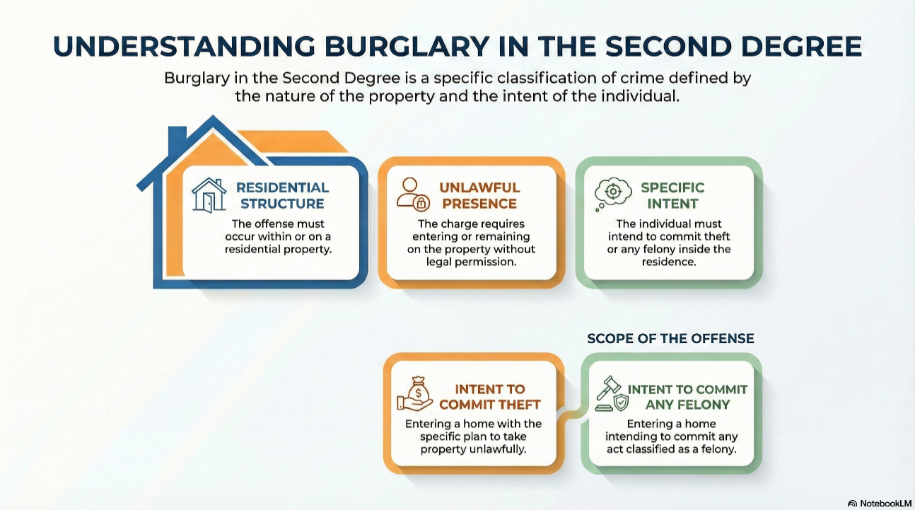 Under ARS 131507, you commit seconddegree burglary if you unlawfully enter or remain inside a residential structure with the intent to commit theft or any felony. This charge is more serious than thirddegree burglary because it involves entering a place where people live. A residential structure includes houses, apartments, mobile homes, condominiums, and any other building used for living purposes.