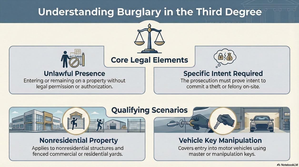 Under ARS 131506, you commit thirddegree burglary when you unlawfully enter or remain in a nonresidential structure, a fenced commercial or residential yard, or a motor vehicle that you access with a manipulation or master key. These places can include storage units, garages, warehouses, enclosed yards, or vehicles.